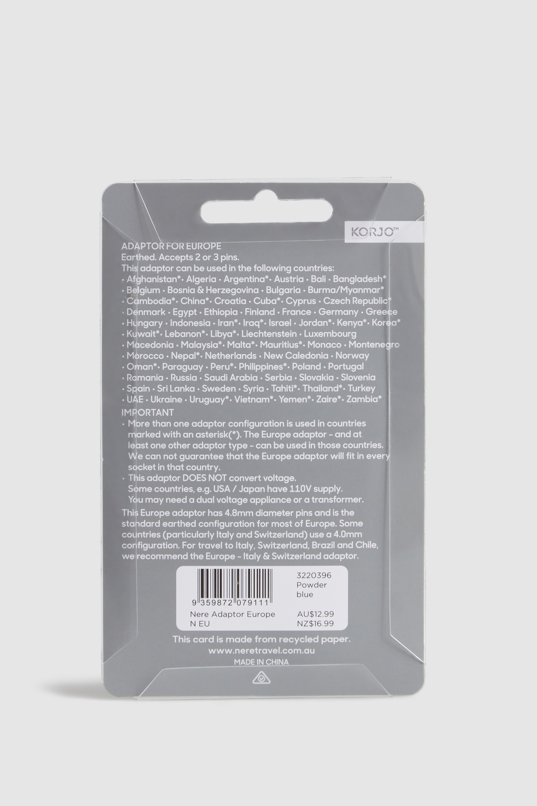 - For Europe & places using EU adaptor